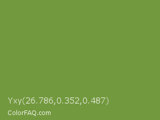 Yxy 26.786,0.352,0.487 Color is a normal green color and the nearest color is Palm Leaf #6f9940. Hex code #73993f and RGB value is rgb(115,153,63). In RGB color space, this color is composed of 45% red, 60% green, 25% blue, In CMYK color space, this color is composed of 25% cyan, 0% magenta, 59% yellow , 40% black , In HSL color space, this color has a hue angle of 85° , 42% saturation and 42% lightness.