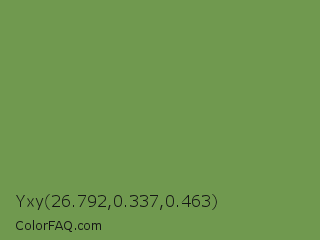 Yxy 26.792,0.337,0.463 Color is a normal green color and the nearest color is Palm Leaf #6f9940. Hex code #70994f and RGB value is rgb(112,153,79). In RGB color space, this color is composed of 44% red, 60% green, 31% blue, In CMYK color space, this color is composed of 27% cyan, 0% magenta, 48% yellow , 40% black , In HSL color space, this color has a hue angle of 93° , 32% saturation and 45% lightness.