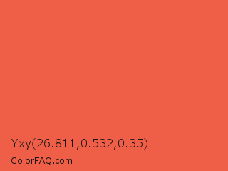 Yxy 26.811,0.532,0.35 Color is a light red color and the nearest color is Orange Soda #fa5b3d. Hex code #ef5e47 and RGB value is rgb(239,94,71). In RGB color space, this color is composed of 94% red, 37% green, 28% blue, In CMYK color space, this color is composed of 0% cyan, 61% magenta, 70% yellow , 6% black , In HSL color space, this color has a hue angle of 8° , 84% saturation and 61% lightness.