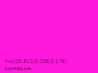 Yxy 26.812,0.358,0.178 Color is a normal magenta color and the nearest color is Hot Magenta #ff1dce. Hex code #fe18dc and RGB value is rgb(254,24,220). In RGB color space, this color is composed of 100% red, 9% green, 86% blue, In CMYK color space, this color is composed of 0% cyan, 91% magenta, 13% yellow , 0% black , In HSL color space, this color has a hue angle of 309° , 99% saturation and 55% lightness.