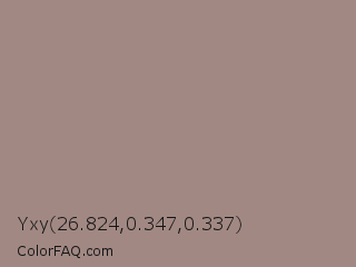 Yxy 26.824,0.347,0.337 Color is a normal red color and the nearest color is Pharlap #a3807b. Hex code #a18883 and RGB value is rgb(161,136,131). In RGB color space, this color is composed of 63% red, 53% green, 51% blue, In CMYK color space, this color is composed of 0% cyan, 16% magenta, 19% yellow , 37% black , In HSL color space, this color has a hue angle of 10° , 14% saturation and 57% lightness.