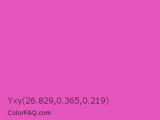 Yxy 26.829,0.365,0.219 Color is a light magenta color and the nearest color is Brilliant Rose #f653a6. Hex code #e555bd and RGB value is rgb(229,85,189). In RGB color space, this color is composed of 90% red, 33% green, 74% blue, In CMYK color space, this color is composed of 0% cyan, 63% magenta, 17% yellow , 10% black , In HSL color space, this color has a hue angle of 317° , 73% saturation and 62% lightness.
