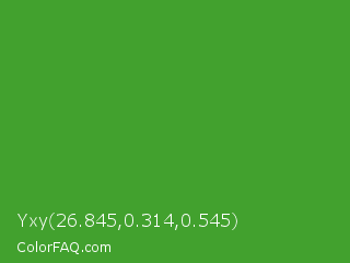 Yxy 26.845,0.314,0.545 Color is a normal green color and the nearest color is Apple #4fa83d. Hex code #42a12e and RGB value is rgb(66,161,46). In RGB color space, this color is composed of 26% red, 63% green, 18% blue, In CMYK color space, this color is composed of 59% cyan, 0% magenta, 71% yellow , 37% black , In HSL color space, this color has a hue angle of 110° , 56% saturation and 41% lightness.