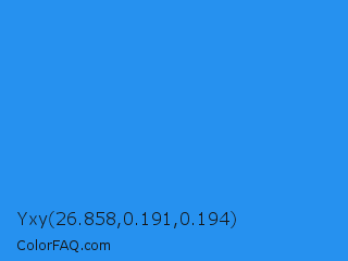 Yxy 26.858,0.191,0.194 Color is a normal blue color and the nearest color is Bleu De France #318ce7. Hex code #2691ef and RGB value is rgb(38,145,239). In RGB color space, this color is composed of 15% red, 57% green, 94% blue, In CMYK color space, this color is composed of 84% cyan, 39% magenta, 0% yellow , 6% black , In HSL color space, this color has a hue angle of 208° , 86% saturation and 54% lightness.
