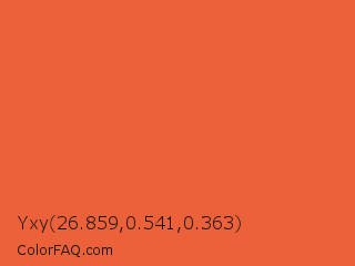 Yxy 26.859,0.541,0.363 Color is a normal red color and the nearest color is Orange Soda #fa5b3d. Hex code #ed613a and RGB value is rgb(237,97,58). In RGB color space, this color is composed of 93% red, 38% green, 23% blue, In CMYK color space, this color is composed of 0% cyan, 59% magenta, 76% yellow , 7% black , In HSL color space, this color has a hue angle of 13° , 83% saturation and 58% lightness.