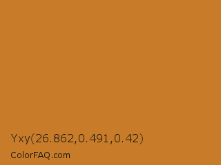 Yxy 26.862,0.491,0.42 Color is a normal orange color and the nearest color is Brandy Punch #cd8429. Hex code #c87c2a and RGB value is rgb(200,124,42). In RGB color space, this color is composed of 78% red, 49% green, 16% blue, In CMYK color space, this color is composed of 0% cyan, 38% magenta, 79% yellow , 22% black , In HSL color space, this color has a hue angle of 31° , 65% saturation and 47% lightness.
