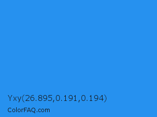 Yxy 26.895,0.191,0.194 Color is a normal blue color and the nearest color is Bleu De France #318ce7. Hex code #2691ef and RGB value is rgb(38,145,239). In RGB color space, this color is composed of 15% red, 57% green, 94% blue, In CMYK color space, this color is composed of 84% cyan, 39% magenta, 0% yellow , 6% black , In HSL color space, this color has a hue angle of 208° , 86% saturation and 54% lightness.