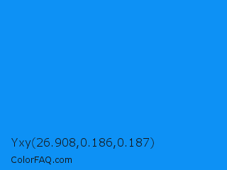 Yxy 26.908,0.186,0.187 Color is a normal blue color and the nearest color is Dodger Blue #1e90ff. Hex code #0d91f5 and RGB value is rgb(13,145,245). In RGB color space, this color is composed of 5% red, 57% green, 96% blue, In CMYK color space, this color is composed of 95% cyan, 41% magenta, 0% yellow , 4% black , In HSL color space, this color has a hue angle of 206° , 92% saturation and 51% lightness.