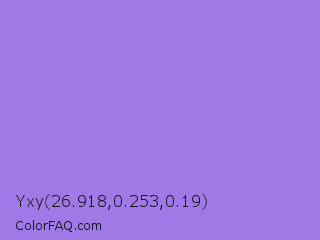 Yxy 26.918,0.253,0.19 Color is a light violet color and the nearest color is Medium Purple #9370db. Hex code #a179e7 and RGB value is rgb(161,121,231). In RGB color space, this color is composed of 63% red, 47% green, 91% blue, In CMYK color space, this color is composed of 30% cyan, 48% magenta, 0% yellow , 9% black , In HSL color space, this color has a hue angle of 262° , 70% saturation and 69% lightness.