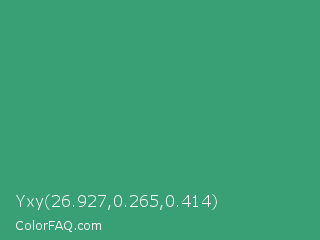 Yxy 26.927,0.265,0.414 Color is a normal green color and the nearest color is Ocean Green #41aa78. Hex code #399f74 and RGB value is rgb(57,159,116). In RGB color space, this color is composed of 22% red, 62% green, 45% blue, In CMYK color space, this color is composed of 64% cyan, 0% magenta, 27% yellow , 38% black , In HSL color space, this color has a hue angle of 155° , 47% saturation and 42% lightness.