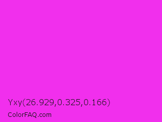 Yxy 26.929,0.325,0.166 Color is a normal magenta color and the nearest color is Razzle Dazzle Rose #ff33cc. Hex code #f12fed and RGB value is rgb(241,47,237). In RGB color space, this color is composed of 95% red, 18% green, 93% blue, In CMYK color space, this color is composed of 0% cyan, 80% magenta, 2% yellow , 5% black , In HSL color space, this color has a hue angle of 301° , 87% saturation and 56% lightness.
