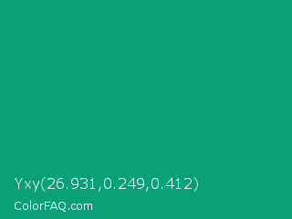 Yxy 26.931,0.249,0.412 Color is a normal cyan color and the nearest color is Gossamer #069b81. Hex code #0aa178 and RGB value is rgb(10,161,120). In RGB color space, this color is composed of 4% red, 63% green, 47% blue, In CMYK color space, this color is composed of 94% cyan, 0% magenta, 25% yellow , 37% black , In HSL color space, this color has a hue angle of 164° , 88% saturation and 34% lightness.