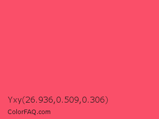 Yxy 26.936,0.509,0.306 Color is a light red color and the nearest color is Infra Red #ff496c. Hex code #fa4f69 and RGB value is rgb(250,79,105). In RGB color space, this color is composed of 98% red, 31% green, 41% blue, In CMYK color space, this color is composed of 0% cyan, 68% magenta, 58% yellow , 2% black , In HSL color space, this color has a hue angle of 351° , 94% saturation and 65% lightness.