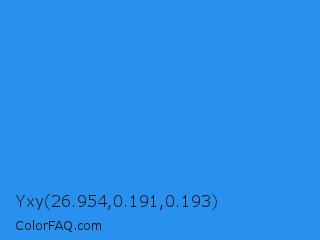 Yxy 26.954,0.191,0.193 Color is a normal blue color and the nearest color is Bleu De France #318ce7. Hex code #2891f0 and RGB value is rgb(40,145,240). In RGB color space, this color is composed of 16% red, 57% green, 94% blue, In CMYK color space, this color is composed of 83% cyan, 40% magenta, 0% yellow , 6% black , In HSL color space, this color has a hue angle of 209° , 87% saturation and 55% lightness.