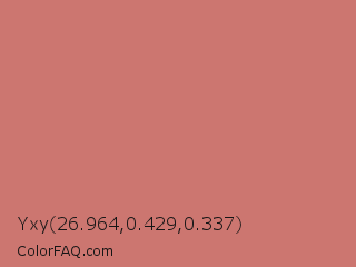 Yxy 26.964,0.429,0.337 Color is a light red color and the nearest color is Contessa #c6726b. Hex code #cc7670 and RGB value is rgb(204,118,112). In RGB color space, this color is composed of 80% red, 46% green, 44% blue, In CMYK color space, this color is composed of 0% cyan, 42% magenta, 45% yellow , 20% black , In HSL color space, this color has a hue angle of 4° , 47% saturation and 62% lightness.