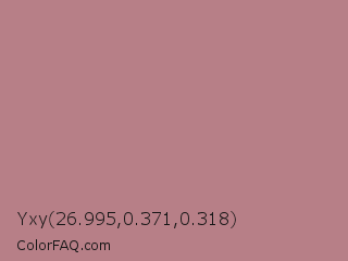 Yxy 26.995,0.371,0.318 Color is a light red color and the nearest color is Old Rose #c08081. Hex code #b77f87 and RGB value is rgb(183,127,135). In RGB color space, this color is composed of 72% red, 50% green, 53% blue, In CMYK color space, this color is composed of 0% cyan, 31% magenta, 26% yellow , 28% black , In HSL color space, this color has a hue angle of 351° , 28% saturation and 61% lightness.