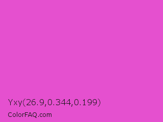 Yxy 26.9,0.344,0.199 Color is a light magenta color and the nearest color is Purple Pizzazz #fe4eda. Hex code #e550cf and RGB value is rgb(229,80,207). In RGB color space, this color is composed of 90% red, 31% green, 81% blue, In CMYK color space, this color is composed of 0% cyan, 65% magenta, 10% yellow , 10% black , In HSL color space, this color has a hue angle of 309° , 74% saturation and 61% lightness.