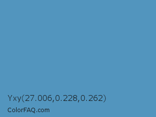 Yxy 27.006,0.228,0.262 Color is a normal blue color and the nearest color is Silver Lake Blue #5d89ba. Hex code #5295be and RGB value is rgb(82,149,190). In RGB color space, this color is composed of 32% red, 58% green, 75% blue, In CMYK color space, this color is composed of 57% cyan, 22% magenta, 0% yellow , 25% black , In HSL color space, this color has a hue angle of 203° , 45% saturation and 53% lightness.
