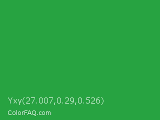 Yxy 27.007,0.29,0.526 Color is a normal green color and the nearest color is Wageningen Green #34b233. Hex code #27a341 and RGB value is rgb(39,163,65). In RGB color space, this color is composed of 15% red, 64% green, 25% blue, In CMYK color space, this color is composed of 76% cyan, 0% magenta, 60% yellow , 36% black , In HSL color space, this color has a hue angle of 133° , 61% saturation and 40% lightness.