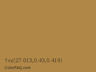 Yxy 27.013,0.43,0.419 Color is a normal orange color and the nearest color is Driftwood #af8751. Hex code #b08747 and RGB value is rgb(176,135,71). In RGB color space, this color is composed of 69% red, 53% green, 28% blue, In CMYK color space, this color is composed of 0% cyan, 23% magenta, 60% yellow , 31% black , In HSL color space, this color has a hue angle of 37° , 43% saturation and 48% lightness.
