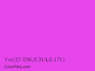 Yxy 27.036,0.314,0.171 Color is a normal magenta color and the nearest color is Purple Pizzazz #fe4eda. Hex code #e545eb and RGB value is rgb(229,69,235). In RGB color space, this color is composed of 90% red, 27% green, 92% blue, In CMYK color space, this color is composed of 3% cyan, 71% magenta, 0% yellow , 8% black , In HSL color space, this color has a hue angle of 298° , 81% saturation and 60% lightness.