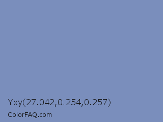 Yxy 27.042,0.254,0.257 Color is a light blue color and the nearest color is Ship Cove #788bba. Hex code #7a8ebc and RGB value is rgb(122,142,188). In RGB color space, this color is composed of 48% red, 56% green, 74% blue, In CMYK color space, this color is composed of 35% cyan, 24% magenta, 0% yellow , 26% black , In HSL color space, this color has a hue angle of 222° , 33% saturation and 61% lightness.