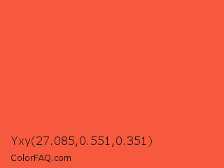 Yxy 27.085,0.551,0.351 Color is a normal red color and the nearest color is Orange Soda #fa5b3d. Hex code #f6593e and RGB value is rgb(246,89,62). In RGB color space, this color is composed of 96% red, 35% green, 24% blue, In CMYK color space, this color is composed of 0% cyan, 64% magenta, 75% yellow , 4% black , In HSL color space, this color has a hue angle of 9° , 91% saturation and 60% lightness.