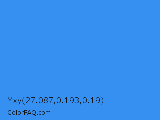 Yxy 27.087,0.193,0.19 Color is a normal blue color and the nearest color is Bleu De France #318ce7. Hex code #3690f2 and RGB value is rgb(54,144,242). In RGB color space, this color is composed of 21% red, 56% green, 95% blue, In CMYK color space, this color is composed of 78% cyan, 40% magenta, 0% yellow , 5% black , In HSL color space, this color has a hue angle of 211° , 88% saturation and 58% lightness.