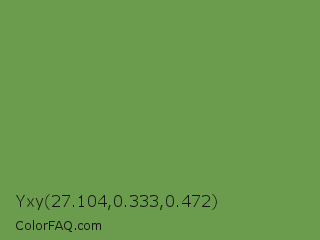 Yxy 27.104,0.333,0.472 Color is a normal green color and the nearest color is Palm Leaf #6f9940. Hex code #6b9b4d and RGB value is rgb(107,155,77). In RGB color space, this color is composed of 42% red, 61% green, 30% blue, In CMYK color space, this color is composed of 31% cyan, 0% magenta, 50% yellow , 39% black , In HSL color space, this color has a hue angle of 97° , 34% saturation and 45% lightness.