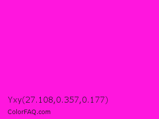 Yxy 27.108,0.357,0.177 Color is a normal magenta color and the nearest color is Hot Magenta #ff1dce. Hex code #ff16de and RGB value is rgb(255,22,222). In RGB color space, this color is composed of 100% red, 9% green, 87% blue, In CMYK color space, this color is composed of 0% cyan, 91% magenta, 13% yellow , 0% black , In HSL color space, this color has a hue angle of 308° , 100% saturation and 54% lightness.