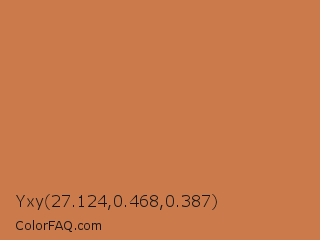 Yxy 27.124,0.468,0.387 Color is a normal orange color and the nearest color is Raw Sienna Crayola #d27d46. Hex code #cb7a4b and RGB value is rgb(203,122,75). In RGB color space, this color is composed of 80% red, 48% green, 29% blue, In CMYK color space, this color is composed of 0% cyan, 40% magenta, 63% yellow , 20% black , In HSL color space, this color has a hue angle of 22° , 55% saturation and 55% lightness.