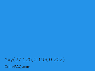 Yxy 27.126,0.193,0.202 Color is a normal blue color and the nearest color is Button Blue #24a0ed. Hex code #2493e9 and RGB value is rgb(36,147,233). In RGB color space, this color is composed of 14% red, 58% green, 91% blue, In CMYK color space, this color is composed of 85% cyan, 37% magenta, 0% yellow , 9% black , In HSL color space, this color has a hue angle of 206° , 82% saturation and 53% lightness.