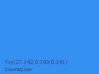 Yxy 27.142,0.193,0.191 Color is a normal blue color and the nearest color is Bleu De France #318ce7. Hex code #3590f2 and RGB value is rgb(53,144,242). In RGB color space, this color is composed of 21% red, 56% green, 95% blue, In CMYK color space, this color is composed of 78% cyan, 40% magenta, 0% yellow , 5% black , In HSL color space, this color has a hue angle of 211° , 88% saturation and 58% lightness.