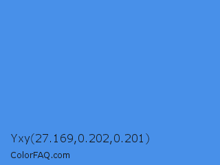 Yxy 27.169,0.202,0.201 Color is a normal blue color and the nearest color is Tufts Blue #3e8ede. Hex code #4890e9 and RGB value is rgb(72,144,233). In RGB color space, this color is composed of 28% red, 56% green, 91% blue, In CMYK color space, this color is composed of 69% cyan, 38% magenta, 0% yellow , 9% black , In HSL color space, this color has a hue angle of 213° , 79% saturation and 60% lightness.
