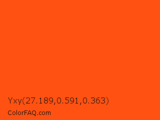 Yxy 27.189,0.591,0.363 Color is a normal orange color and the nearest color is Orioles Orange #fb4f14. Hex code #ff5111 and RGB value is rgb(255,81,17). In RGB color space, this color is composed of 100% red, 32% green, 7% blue, In CMYK color space, this color is composed of 0% cyan, 68% magenta, 93% yellow , 0% black , In HSL color space, this color has a hue angle of 16° , 100% saturation and 53% lightness.