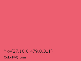 Yxy 27.18,0.479,0.311 Color is a light red color and the nearest color is Light Carmine Pink #e66771. Hex code #ed5e70 and RGB value is rgb(237,94,112). In RGB color space, this color is composed of 93% red, 37% green, 44% blue, In CMYK color space, this color is composed of 0% cyan, 60% magenta, 53% yellow , 7% black , In HSL color space, this color has a hue angle of 352° , 80% saturation and 65% lightness.