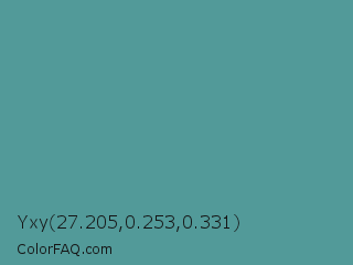 Yxy 27.205,0.253,0.331 Color is a normal cyan color and the nearest color is Breaker Bay #5da19f. Hex code #529a99 and RGB value is rgb(82,154,153). In RGB color space, this color is composed of 32% red, 60% green, 60% blue, In CMYK color space, this color is composed of 47% cyan, 0% magenta, 1% yellow , 40% black , In HSL color space, this color has a hue angle of 179° , 31% saturation and 46% lightness.