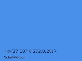Yxy 27.207,0.202,0.201 Color is a normal blue color and the nearest color is Tufts Blue #3e8ede. Hex code #4890e9 and RGB value is rgb(72,144,233). In RGB color space, this color is composed of 28% red, 56% green, 91% blue, In CMYK color space, this color is composed of 69% cyan, 38% magenta, 0% yellow , 9% black , In HSL color space, this color has a hue angle of 213° , 79% saturation and 60% lightness.