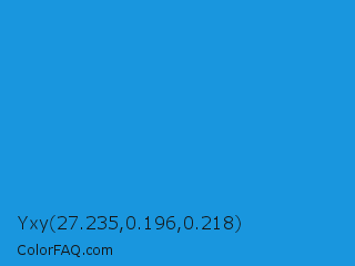 Yxy 27.235,0.196,0.218 Color is a normal blue color and the nearest color is Curious Blue #2596d1. Hex code #1996de and RGB value is rgb(25,150,222). In RGB color space, this color is composed of 10% red, 59% green, 87% blue, In CMYK color space, this color is composed of 89% cyan, 32% magenta, 0% yellow , 13% black , In HSL color space, this color has a hue angle of 202° , 80% saturation and 48% lightness.