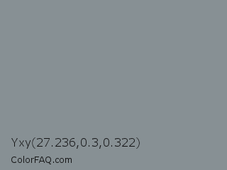 Yxy 27.236,0.3,0.322 Color is a normal blue color and the nearest color is Oslo Gray #878d91. Hex code #879094 and RGB value is rgb(135,144,148). In RGB color space, this color is composed of 53% red, 56% green, 58% blue, In CMYK color space, this color is composed of 9% cyan, 3% magenta, 0% yellow , 42% black , In HSL color space, this color has a hue angle of 198° , 6% saturation and 55% lightness.