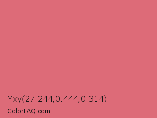 Yxy 27.244,0.444,0.314 Color is a light red color and the nearest color is Candy Pink #e4717a. Hex code #dd6b78 and RGB value is rgb(221,107,120). In RGB color space, this color is composed of 87% red, 42% green, 47% blue, In CMYK color space, this color is composed of 0% cyan, 52% magenta, 46% yellow , 13% black , In HSL color space, this color has a hue angle of 353° , 63% saturation and 64% lightness.
