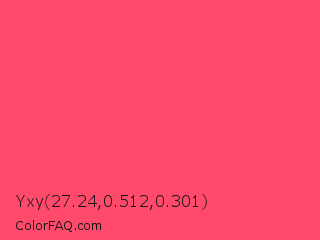 Yxy 27.24,0.512,0.301 Color is a light red color and the nearest color is Infra Red #ff496c. Hex code #ff4a6c and RGB value is rgb(255,74,108). In RGB color space, this color is composed of 100% red, 29% green, 42% blue, In CMYK color space, this color is composed of 0% cyan, 71% magenta, 58% yellow , 0% black , In HSL color space, this color has a hue angle of 349° , 100% saturation and 65% lightness.