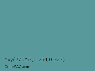Yxy 27.257,0.254,0.323 Color is a normal cyan color and the nearest color is Cadet Blue #5f9ea0. Hex code #58999c and RGB value is rgb(88,153,156). In RGB color space, this color is composed of 35% red, 60% green, 61% blue, In CMYK color space, this color is composed of 44% cyan, 2% magenta, 0% yellow , 39% black , In HSL color space, this color has a hue angle of 183° , 28% saturation and 48% lightness.
