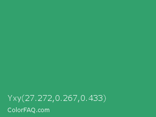 Yxy 27.272,0.267,0.433 Color is a normal green color and the nearest color is Illuminating Emerald #319177. Hex code #32a16d and RGB value is rgb(50,161,109). In RGB color space, this color is composed of 20% red, 63% green, 43% blue, In CMYK color space, this color is composed of 69% cyan, 0% magenta, 32% yellow , 37% black , In HSL color space, this color has a hue angle of 152° , 53% saturation and 41% lightness.