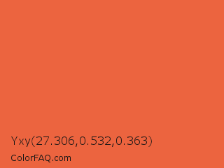 Yxy 27.306,0.532,0.363 Color is a normal red color and the nearest color is Orange Soda #fa5b3d. Hex code #ec643f and RGB value is rgb(236,100,63). In RGB color space, this color is composed of 93% red, 39% green, 25% blue, In CMYK color space, this color is composed of 0% cyan, 58% magenta, 73% yellow , 7% black , In HSL color space, this color has a hue angle of 13° , 82% saturation and 59% lightness.