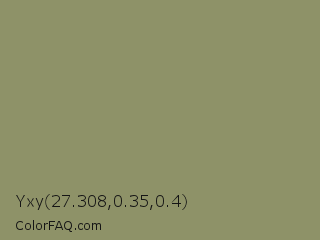 Yxy 27.308,0.35,0.4 Color is a normal yellow color and the nearest color is Avocado Pulp #888d65. Hex code #8e9268 and RGB value is rgb(142,146,104). In RGB color space, this color is composed of 56% red, 57% green, 41% blue, In CMYK color space, this color is composed of 3% cyan, 0% magenta, 29% yellow , 43% black , In HSL color space, this color has a hue angle of 66° , 17% saturation and 49% lightness.