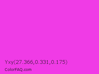 Yxy 27.366,0.331,0.175 Color is a normal magenta color and the nearest color is Purple Pizzazz #fe4eda. Hex code #f03be6 and RGB value is rgb(240,59,230). In RGB color space, this color is composed of 94% red, 23% green, 90% blue, In CMYK color space, this color is composed of 0% cyan, 75% magenta, 4% yellow , 6% black , In HSL color space, this color has a hue angle of 303° , 86% saturation and 59% lightness.