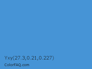 Yxy 27.3,0.21,0.227 Color is a normal blue color and the nearest color is Celestial Blue #4997d0. Hex code #4694d6 and RGB value is rgb(70,148,214). In RGB color space, this color is composed of 27% red, 58% green, 84% blue, In CMYK color space, this color is composed of 67% cyan, 31% magenta, 0% yellow , 16% black , In HSL color space, this color has a hue angle of 208° , 64% saturation and 56% lightness.