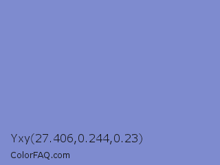 Yxy 27.406,0.244,0.23 Color is a light blue color and the nearest color is Chetwode Blue #8581d9. Hex code #7e8bcf and RGB value is rgb(126,139,207). In RGB color space, this color is composed of 49% red, 55% green, 81% blue, In CMYK color space, this color is composed of 39% cyan, 33% magenta, 0% yellow , 19% black , In HSL color space, this color has a hue angle of 230° , 46% saturation and 65% lightness.