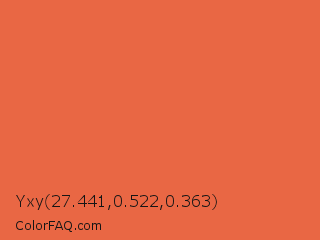 Yxy 27.441,0.522,0.363 Color is a normal red color and the nearest color is Red Damask #da6a41. Hex code #e96744 and RGB value is rgb(233,103,68). In RGB color space, this color is composed of 91% red, 40% green, 27% blue, In CMYK color space, this color is composed of 0% cyan, 56% magenta, 71% yellow , 9% black , In HSL color space, this color has a hue angle of 13° , 79% saturation and 59% lightness.